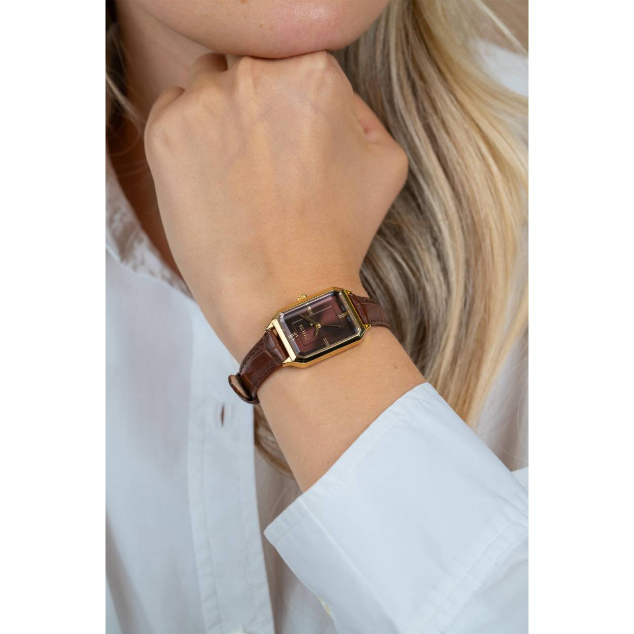 Allure horloge 30mm achthoekige kast, bruine wijzerplaat, geelgoudkleurige kast en leren band, Japans uurwerk