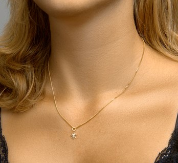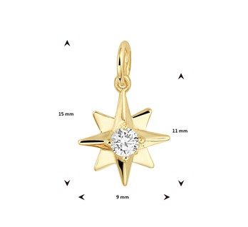 14k Geelgouden hanger in de vorm van een ster uitgevoerd met een schitterende zirkonia. De hanger heeft een totale hoogte van 1.5cm en een breedte van 9mm.