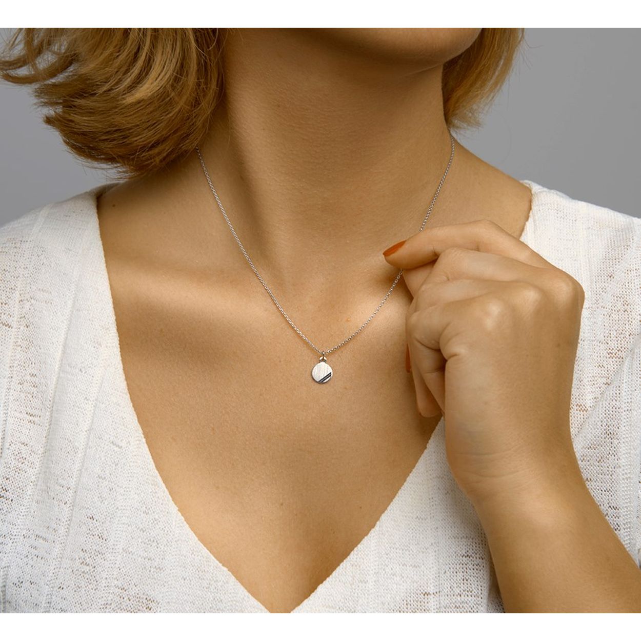 Gerhodineerd 925 zilveren ronde graveerhanger met een mat/gediamanteerde afwerking. De hanger heeft een totale hoogte van 1.4cm en een diameter van 9mm.