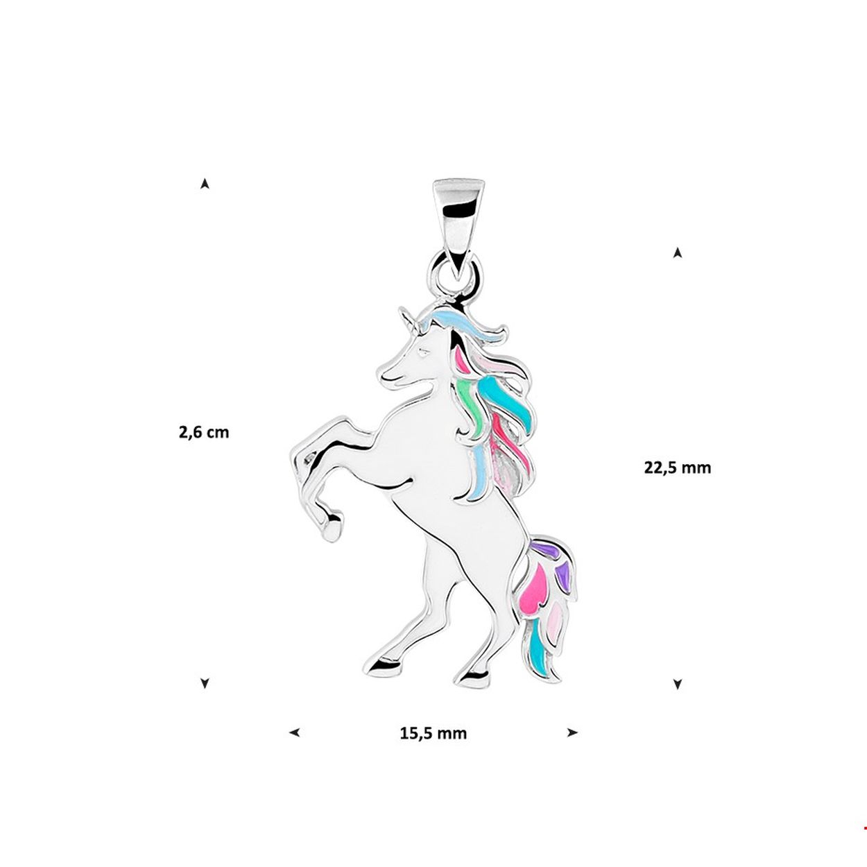 Beschrijving: Gerhodineerd zilveren eenhoorn hanger met een afmeting van 26x15.5mm. Deze hanger is perfect te combineren met een bijpassend collier uit onze collectie. Info: Gerhodineerd zilver is door de rhodiumlaag beter bestand tegen verkleuren en krassen.