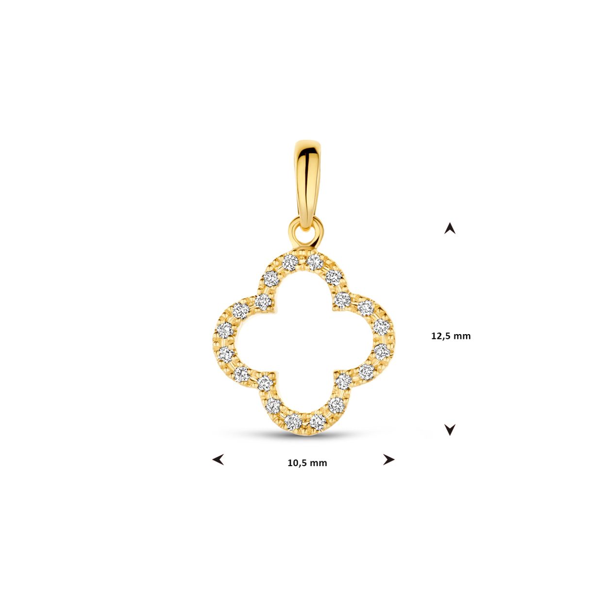 14k Geelgouden hanger uitgevoerd in de vorm van een klavertje. De hanger heeft een totale hoogte van 17mm. De totale diamantgewicht.