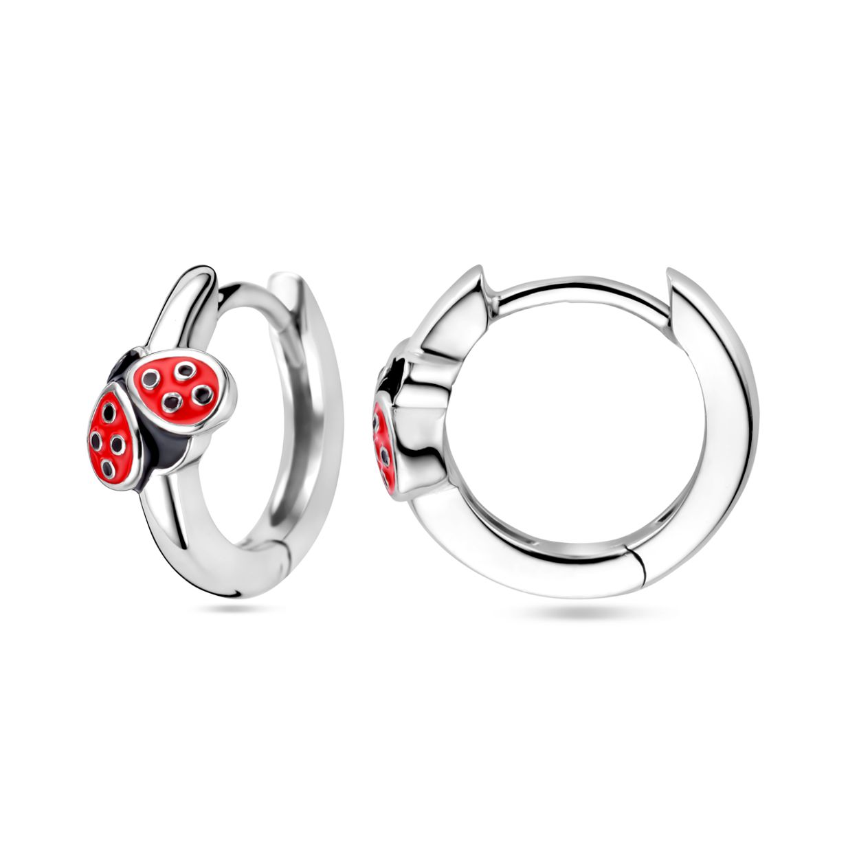 Gerhodineerd 925 zilveren klapoorringen uitgevoerd in de vorm van een lieveheersbeestje met rood en zwart emaille. De oorringen hebben een diameter van 12x5mm.