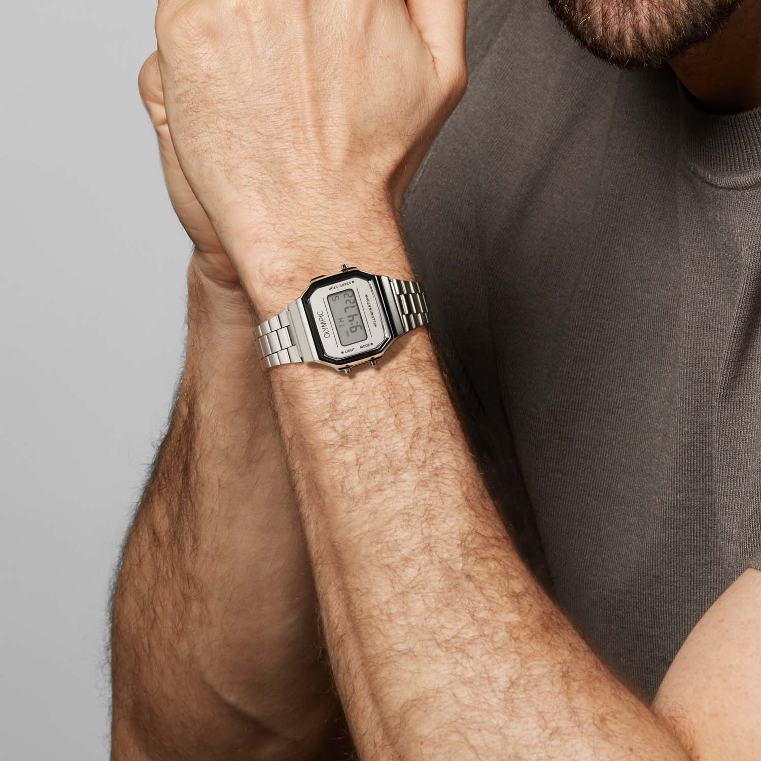 Dit unieke Olympic horloge met artikelnummer: OL66HKS002 is een digitaal horloge met een sportieve uitstraling. Het horloge heeft een rechthoekige metalen kast met een wit digitaal venster met grijze accenten. Het horloge heeft meerdere functies zoals, tijd, datum, stopwatch, alarm en verlichting. Aan de kast zit een zilverkleurige stalen matte schakelband met kliksluiting. Het horloge heeft een mineraalglas, een afmeting van 38,6x 36,3mm en is 3ATM.
