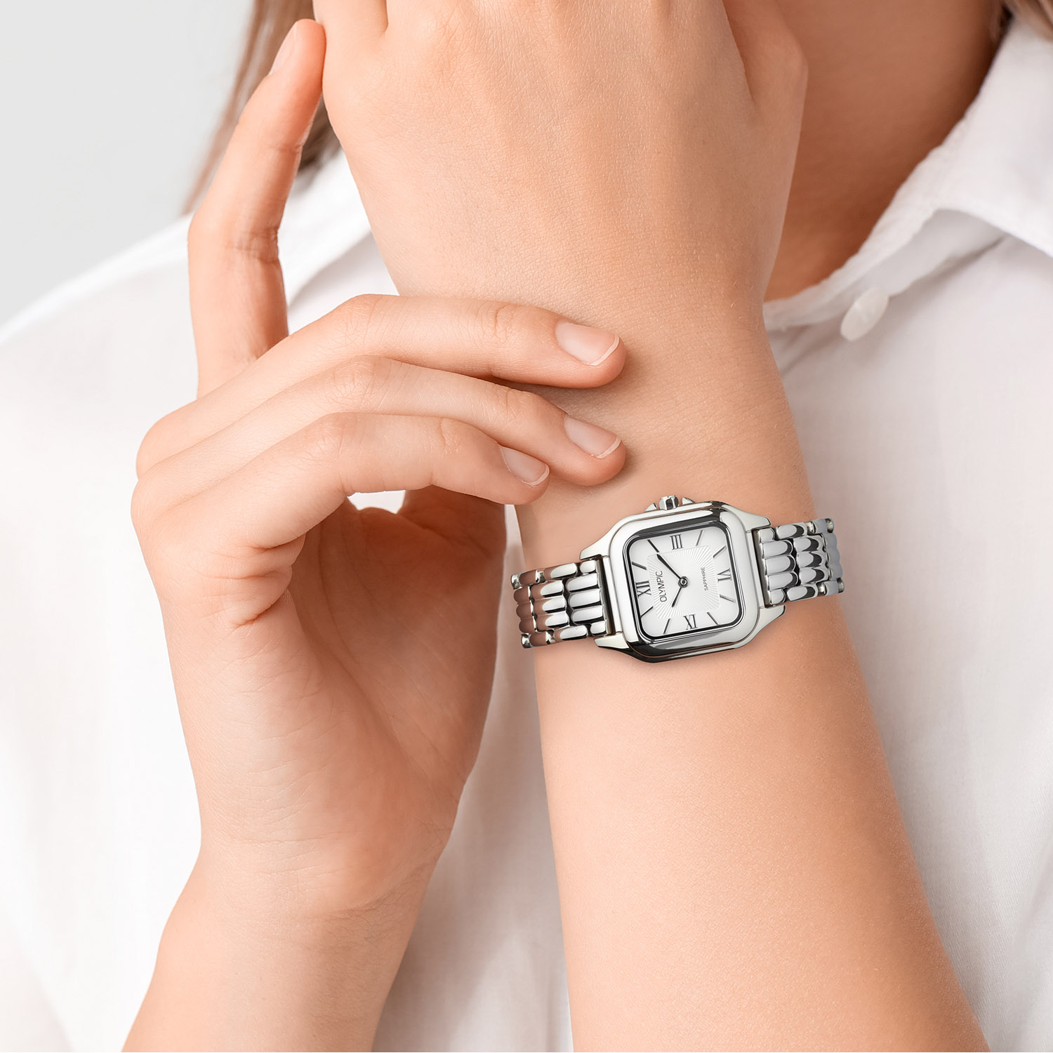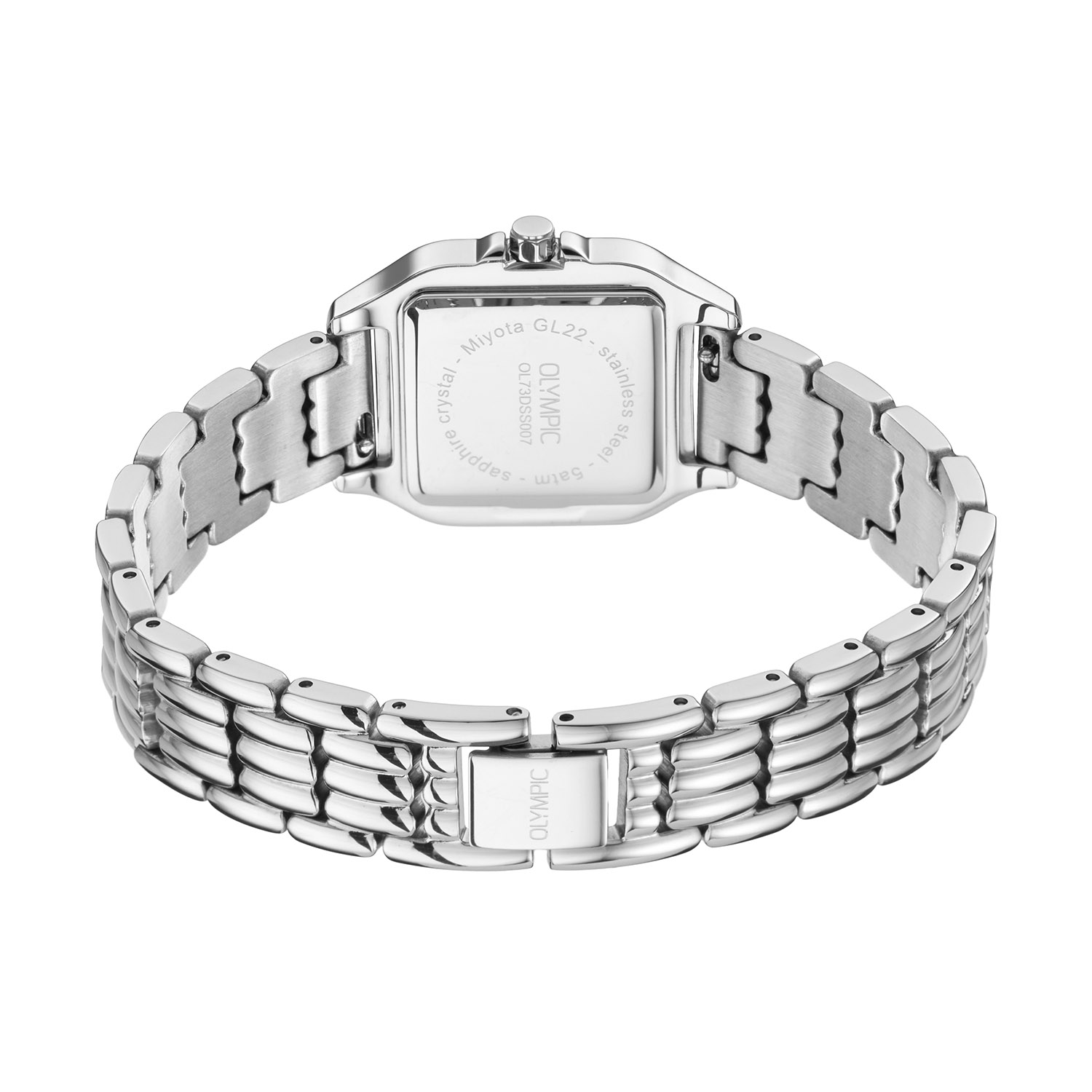Dit unieke Olympic model met artikelnummer: OL73DSS007 is een chique dameshorloge. Het horloge heeft een stalen vierkante kast met een gladde bezel en een zilverwitte wijzerplaat met strepen en romeinse cijfers. Aan de kast zit een stalen schakelband met een druksluiting. Het horloge heeft een saffierglas, een doorsnee van 26mm en is 5ATM.