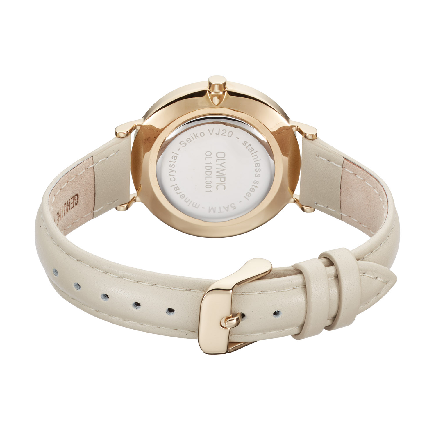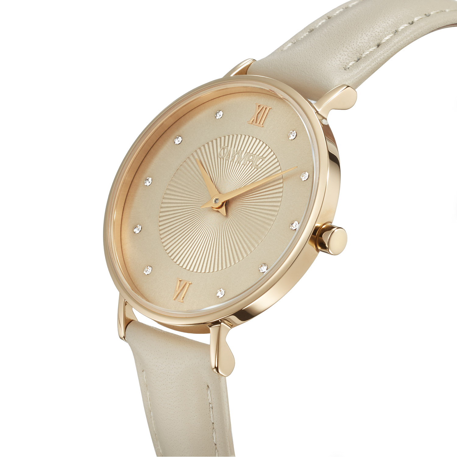 Dit unieke Olympic model met artikelnummer: OL1DDL001 is een fijn dameshorloge. Het horloge heeft een goudkleurige stalen kast met een champagnekleurige bewerkte sunray wijzerplaat met kristallen als uursaanduiding. Aan de kast zit een beige lerenband met een gespsluiting. Het horloge heeft een mineraalglas, een doorsnee van 32mm en is 5ATM.