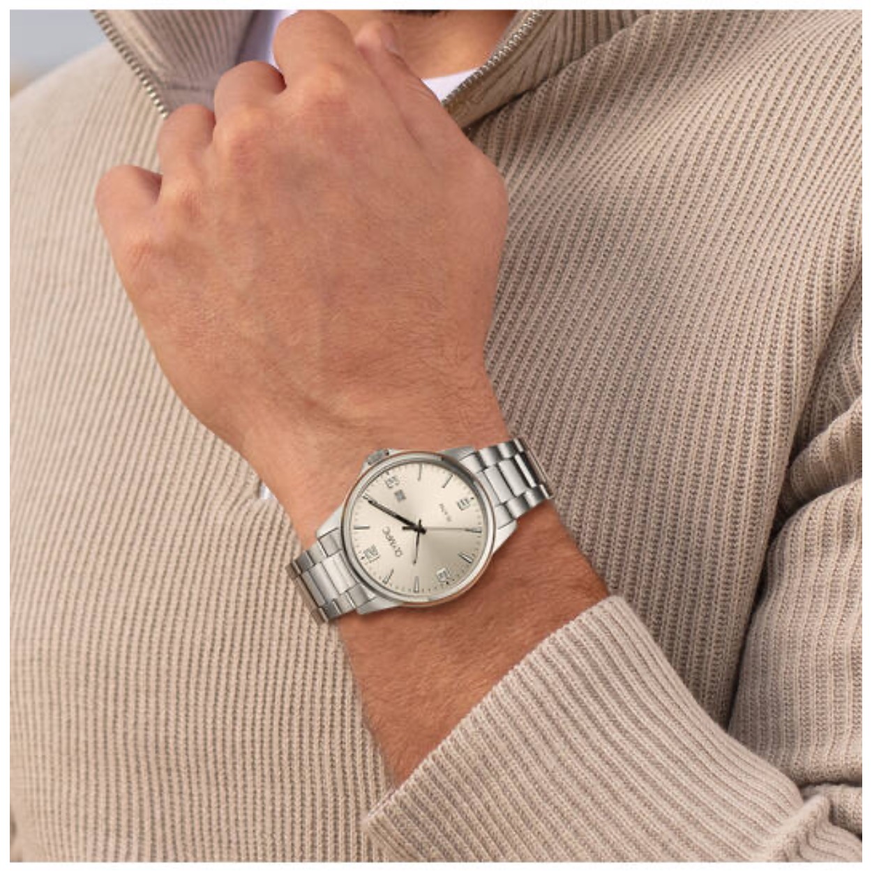 Dit unieke Olympic horloge met artikelnummer: OL26HSS319 is een klassiek horloge. De ronde stalen kast heeft een gladde bezel en een zilver grijze wijzerplaat met een datum aanduiding. Aan de kast zit een stalen schakelband met een vouwsluiting. Het horloge heeft een mineraalglas een doorsnee van 40mm en is 10ATM.