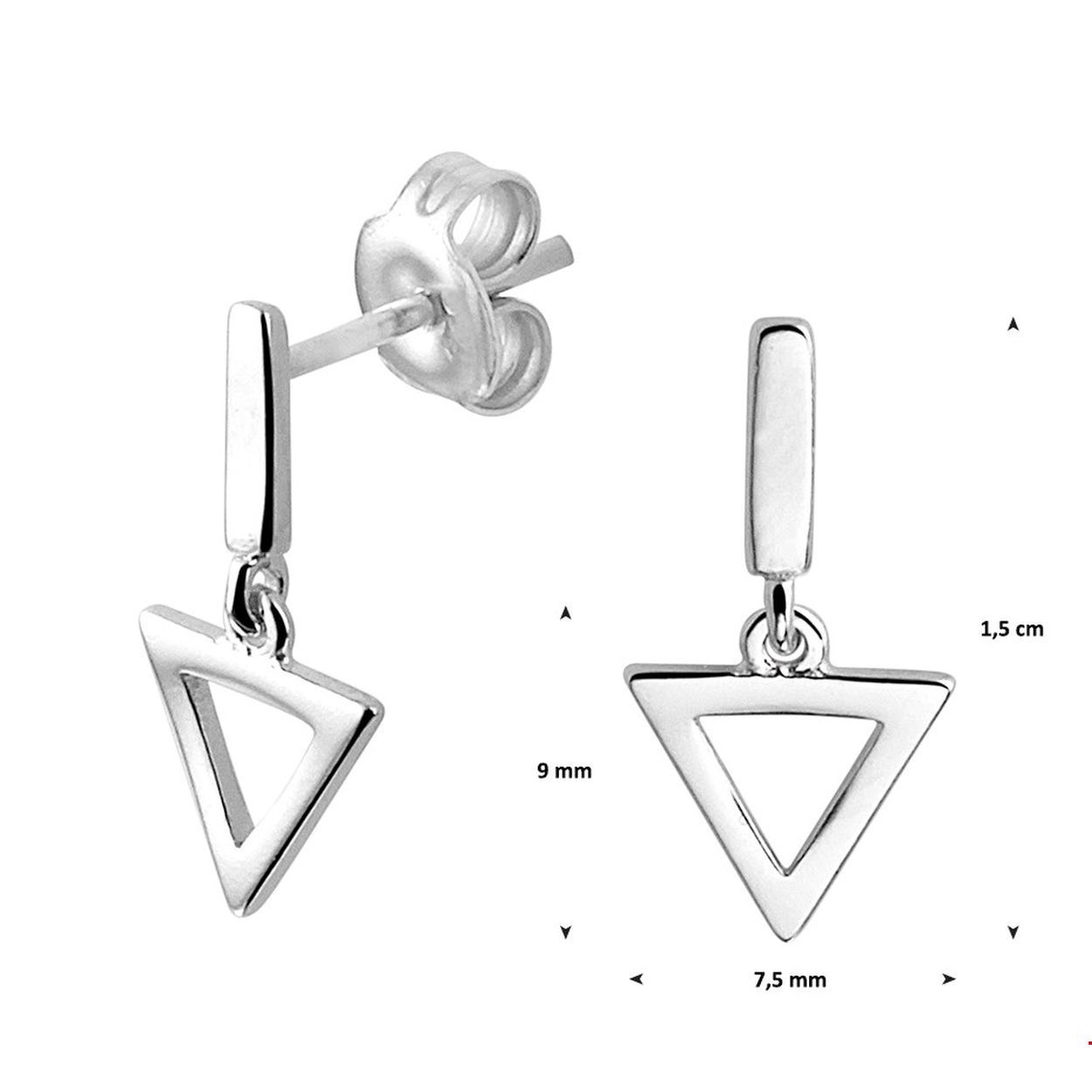 Beschrijving: Trendy gerhodineerd zilveren oorhangers met een balkje en een open driehoek. De oorhangers hebben een hoogte van 1,5cm. Tip: Leuk om kado te geven! Zie je ze al stralen?