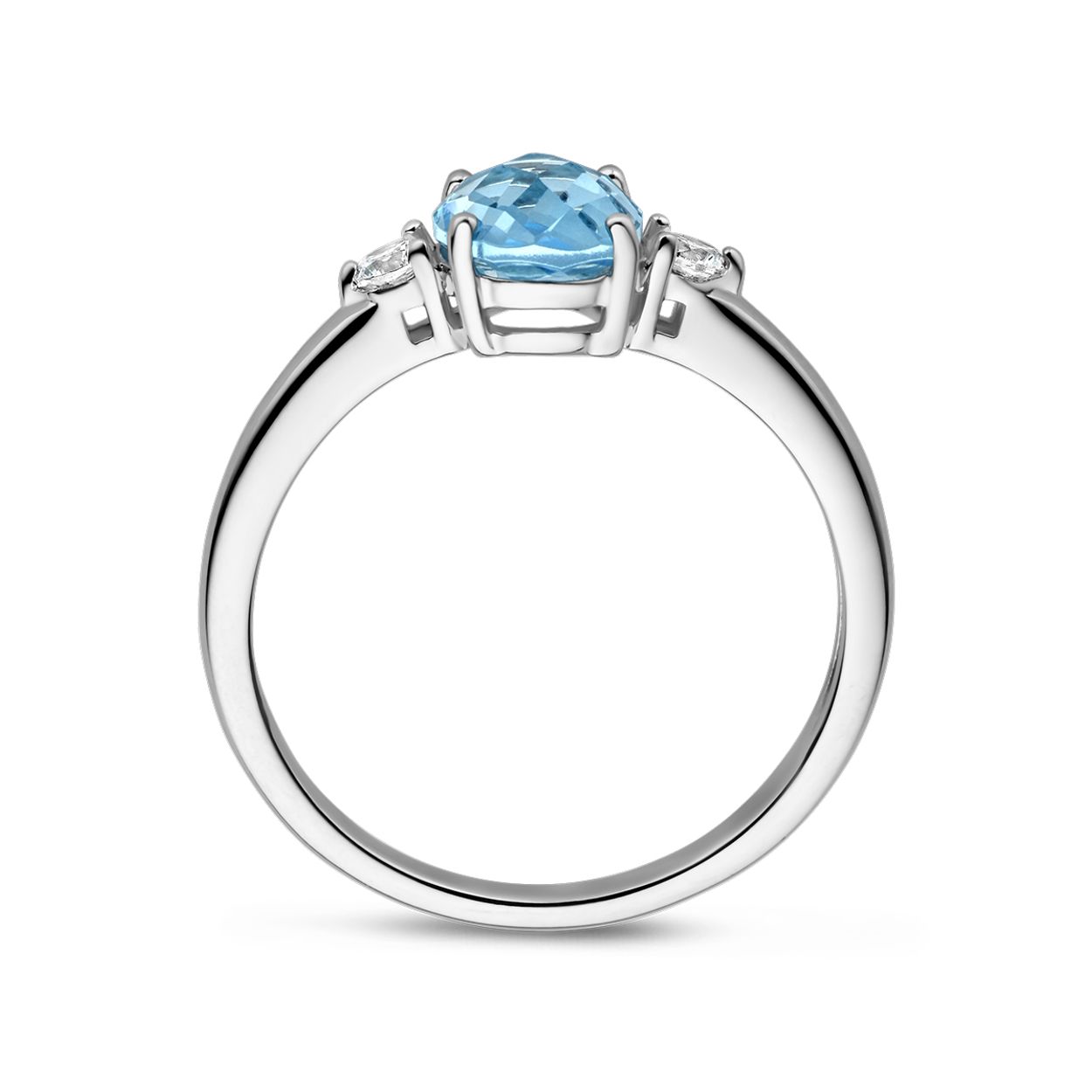 Gerhodineerd 925 zilveren ring uitgevoerd met blauw topaas en zirkonia. De steen heeft een afmeting van 8x6mm.