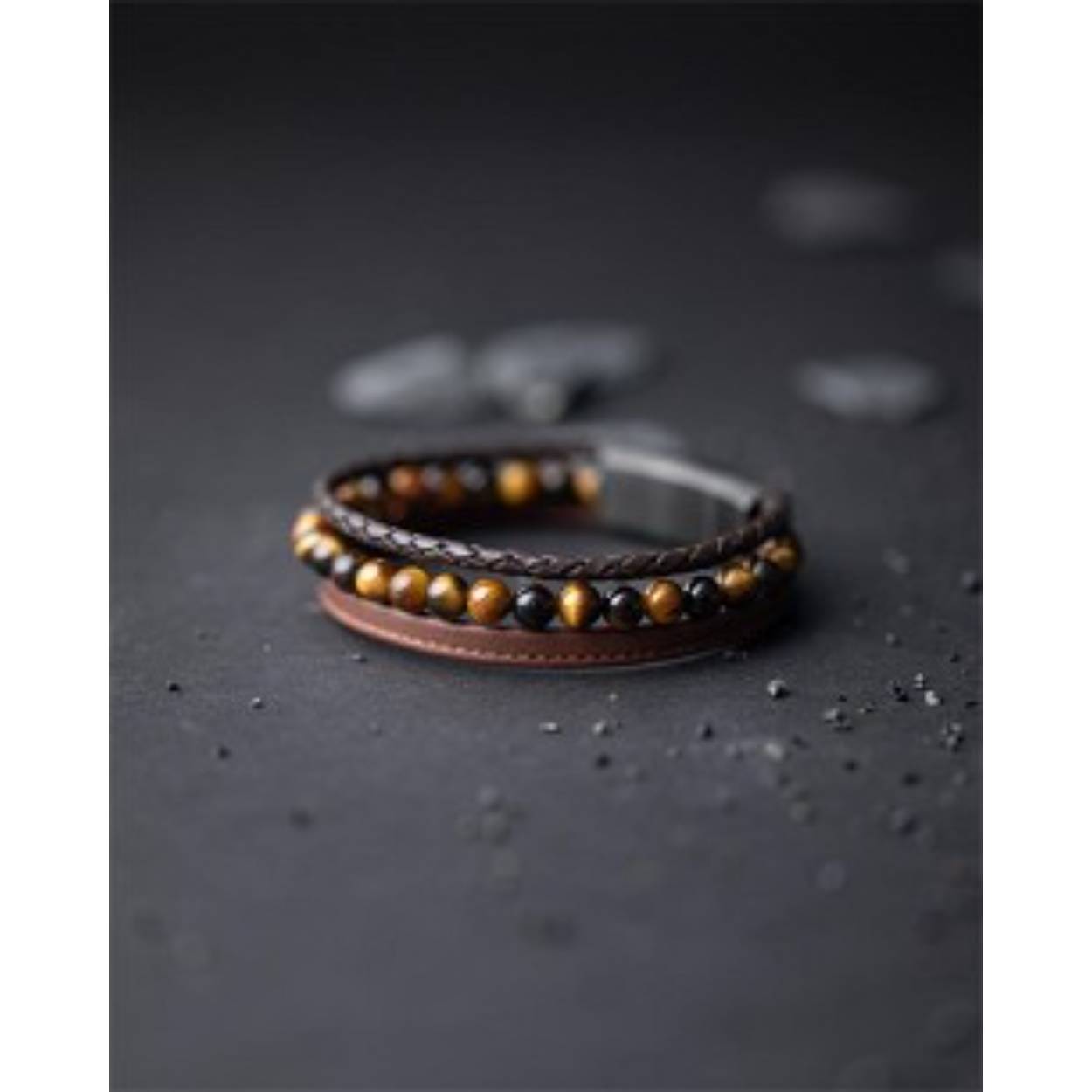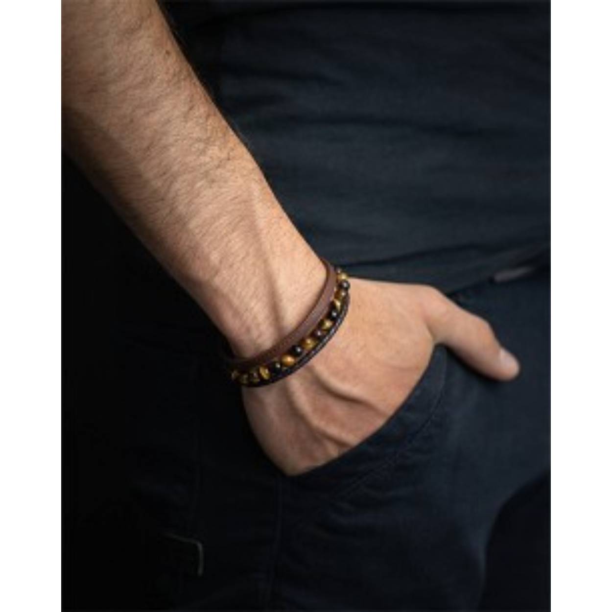Gemini Olympus Double Brown O32  is een dubbele armband met Italiaans leder en 4 mm tijgeroog stenen op 20 of 21 cm lengte